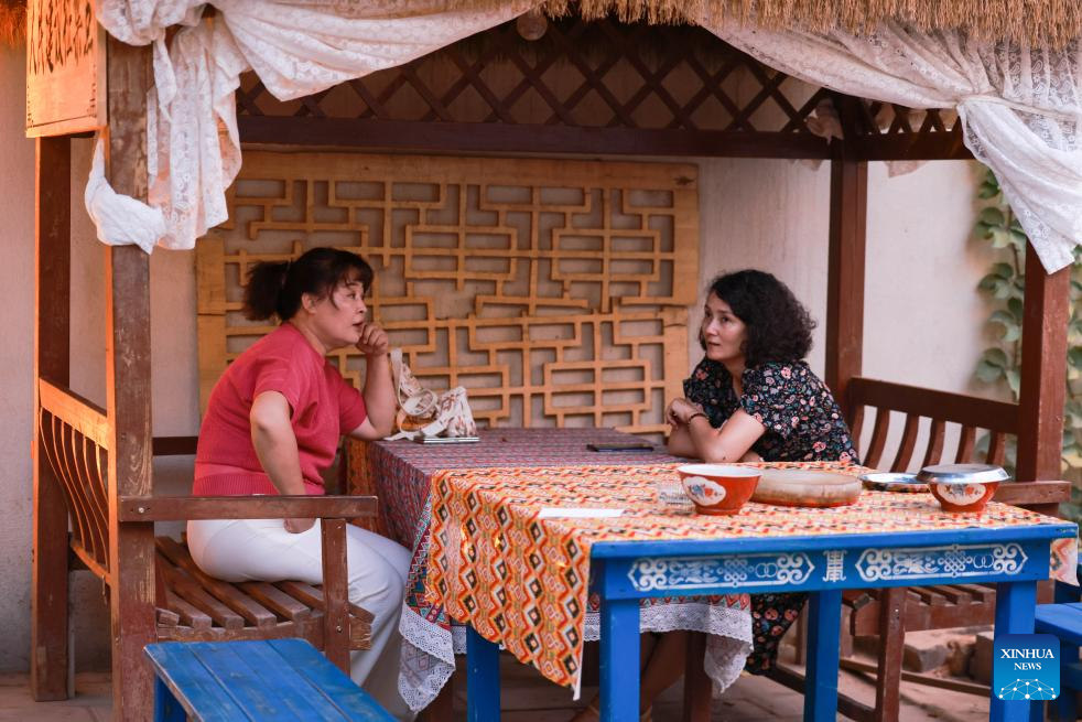 Locals have a meal in a courtyard at the Qiuci Alley in Kuqa City, northwest China's Xinjiang Uygur Autonomous Region, on July 17, 2025. Kuqa City in recent years has continuously renovated and upgraded the Qiuci Alley ("Qiuci" is a Chinese pinyin form of Kuqa), which sits at the core area of the city. While retaining the original layout of the historical street, the renovation aimed to improve the habitat environment and enrich tourists' experience. (Xinhua/Meng Tao)