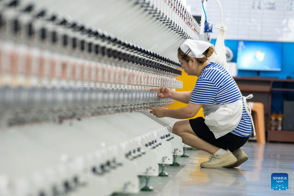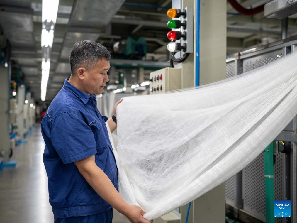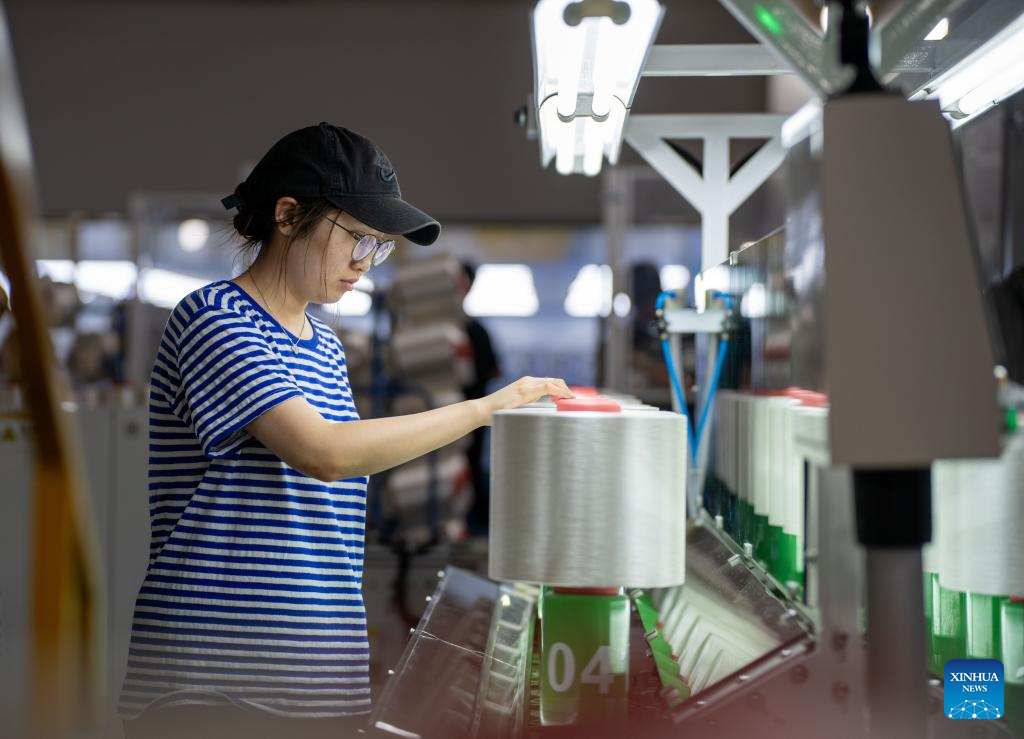 A staff member checks the spinning materials at a workshop in Jilin Chemical Fiber Group in Jilin City, northeast China's Jilin Province, July 16, 2025. Jilin Chemical Fiber Group was among the key state-owned enterprises deployed in the Northeast -- a region comprising Liaoning, Jilin, Heilongjiang, and eastern Inner Mongolia -- shortly after the founding of New China in 1949.