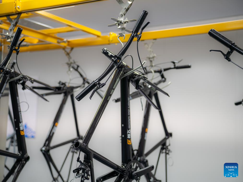 This photo shows bicycle frames made from carbon fiber at Jilin Chemical Fiber Group in Jilin City, northeast China's Jilin Province, July 16, 2025. Jilin Chemical Fiber Group was among the key state-owned enterprises deployed in the Northeast -- a region comprising Liaoning, Jilin, Heilongjiang, and eastern Inner Mongolia -- shortly after the founding of New China in 1949.
