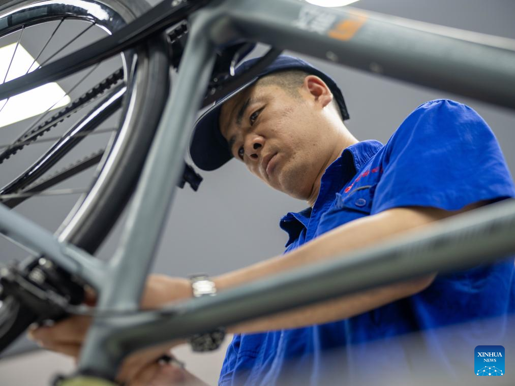 A staff member assembles carbon fiber bicycle frames at a workshop in Jilin Chemical Fiber Group in Jilin City, northeast China's Jilin Province, July 16, 2025. Jilin Chemical Fiber Group was among the key state-owned enterprises deployed in the Northeast -- a region comprising Liaoning, Jilin, Heilongjiang, and eastern Inner Mongolia -- shortly after the founding of New China in 1949.