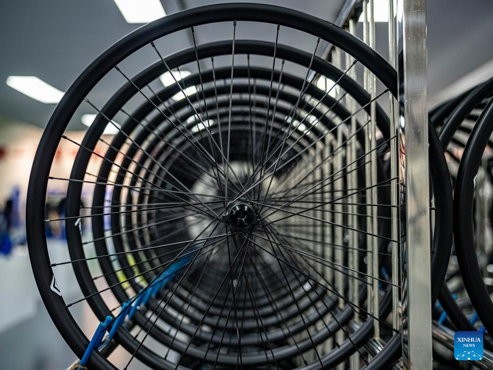This photo shows bicycle wheels made from carbon fiber at Jilin Chemical Fiber Group in Jilin City, northeast China's Jilin Province, July 16, 2025. Jilin Chemical Fiber Group was among the key state-owned enterprises deployed in the Northeast -- a region comprising Liaoning, Jilin, Heilongjiang, and eastern Inner Mongolia -- shortly after the founding of New China in 1949.