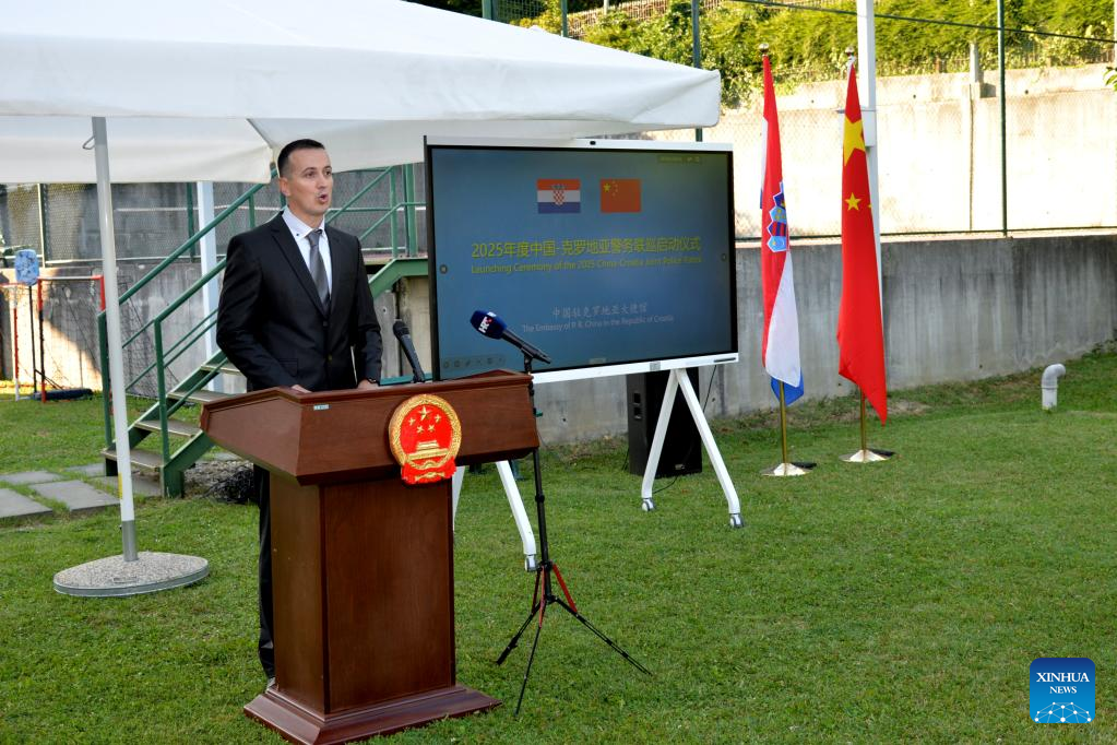Ante Maric, representative of the Croatian Police General Administration, speaks during the launching ceremony of the sixth China-Croatia joint police patrol at the Chinese Embassy in Croatia in Zagreb, Croatia, July 17, 2025. The sixth China-Croatia joint police patrol was launched here on Thursday, with eight Chinese police officers joining the one-month mission in four of Croatia's top destinations for Chinese tourists, including Zagreb, Dubrovnik, Zadar, and Plitvice Lakes National Park. (Xinhua/Li Xuejun)