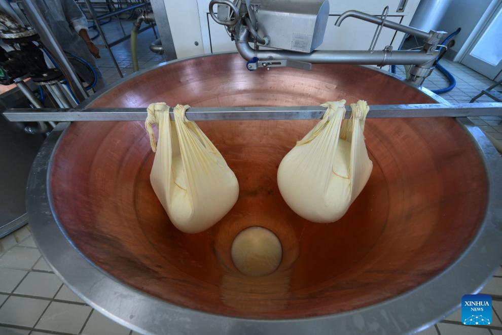 Employees at the Caseificio San Bernardino cheese dairy use a linen cloth to lift the cheese granules during the production of Parmigiano Reggiano at Caseificio San Bernardino, in Tortiano, Parma, Italy, July 17 2025. Italy's renowned Parmigiano Reggiano cheese is made from cow's milk and produced exclusively in certain regions of northern Italy. (Photo by Alberto Lingria/Xinhua)