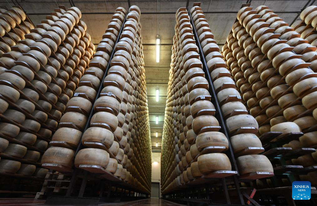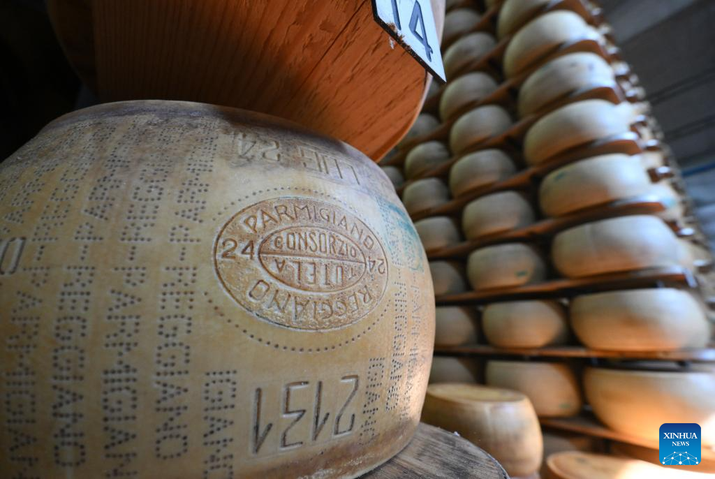 Parmigiano Reggiano cheese wheels are seen at the Caseificio San Bernardino cheese dairy in Tortiano, Parma, Italy, July 17, 2025. Italy's renowned Parmigiano Reggiano cheese is made from cow's milk and produced exclusively in certain regions of northern Italy. (Photo by Alberto Lingria/Xinhua)