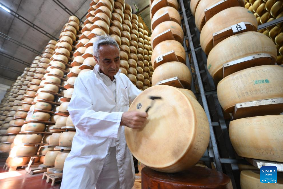 A staff of quality control inspects a product of Parmigiano Reggiano at the Caseificio San Bernardino cheese dairy in Tortiano, Parma, Italy, July 17, 2025. Italy's renowned Parmigiano Reggiano cheese is made from cow's milk and produced exclusively in certain regions of northern Italy. (Photo by Alberto Lingria/Xinhua)