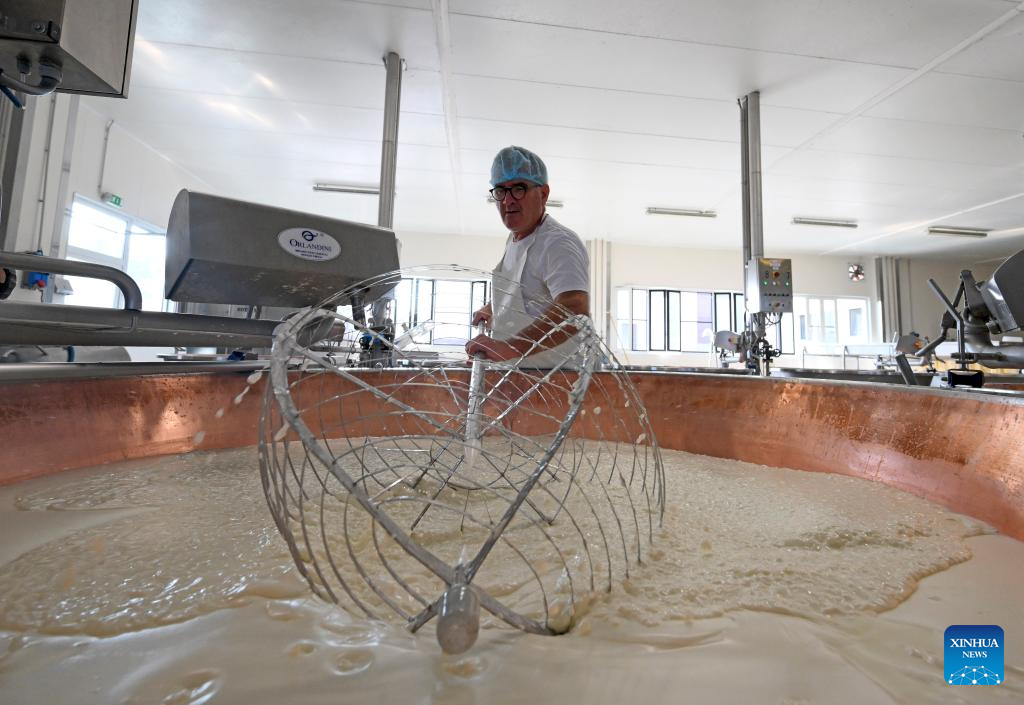 Daniele Dadomo, known as "Casaro," the cheesemaker, works with Parmigiano Reggiano at the Caseificio San Bernardino cheese dairy in Tortiano, Parma, Italy, July 17, 2025. Italy's renowned Parmigiano Reggiano cheese is made from cow's milk and produced exclusively in certain regions of northern Italy. (Photo by Alberto Lingria/Xinhua)