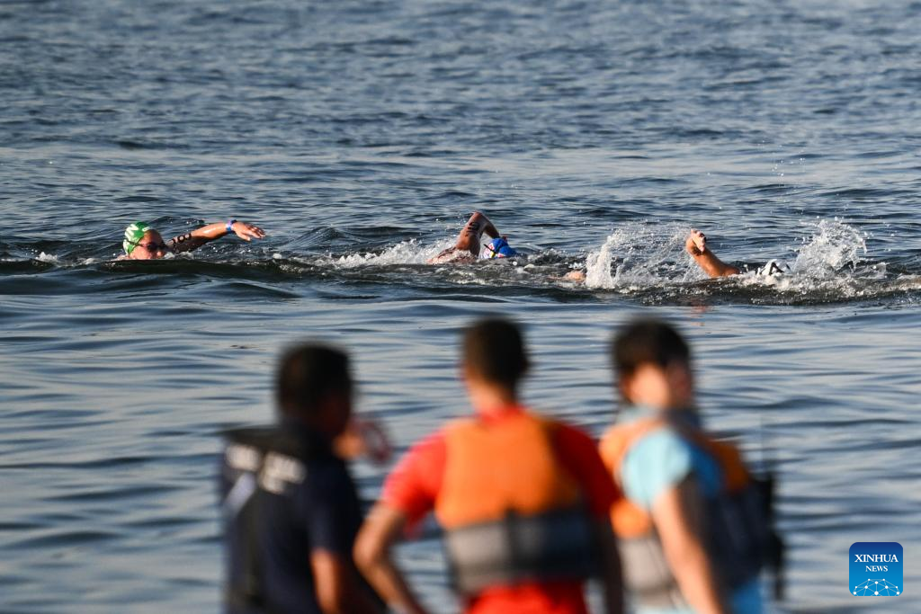 Swimmers compete during the women's 5km final of open water at the World Aquatics Championships 2025 in Singapore, July 18, 2025. (Xinhua/Luo Yuan)
