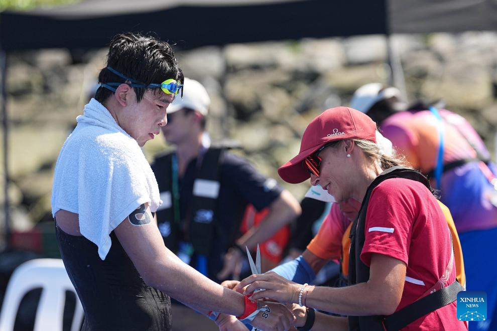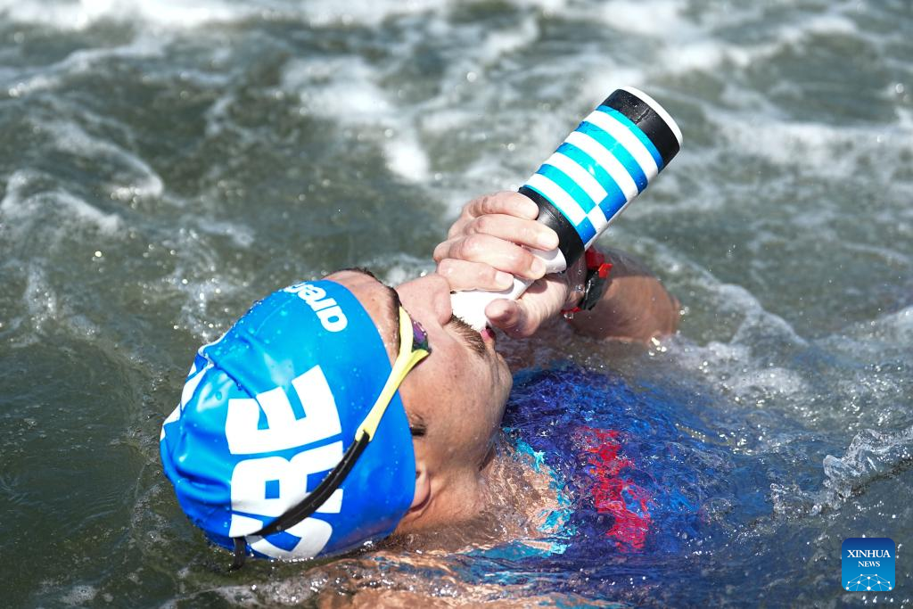 Athanasios Kynigakis of Greece hydrates during the men's 5km final of open water at the World Aquatics Championships 2025 in Singapore, July 18, 2025. (Xinhua/Xue Yuge)