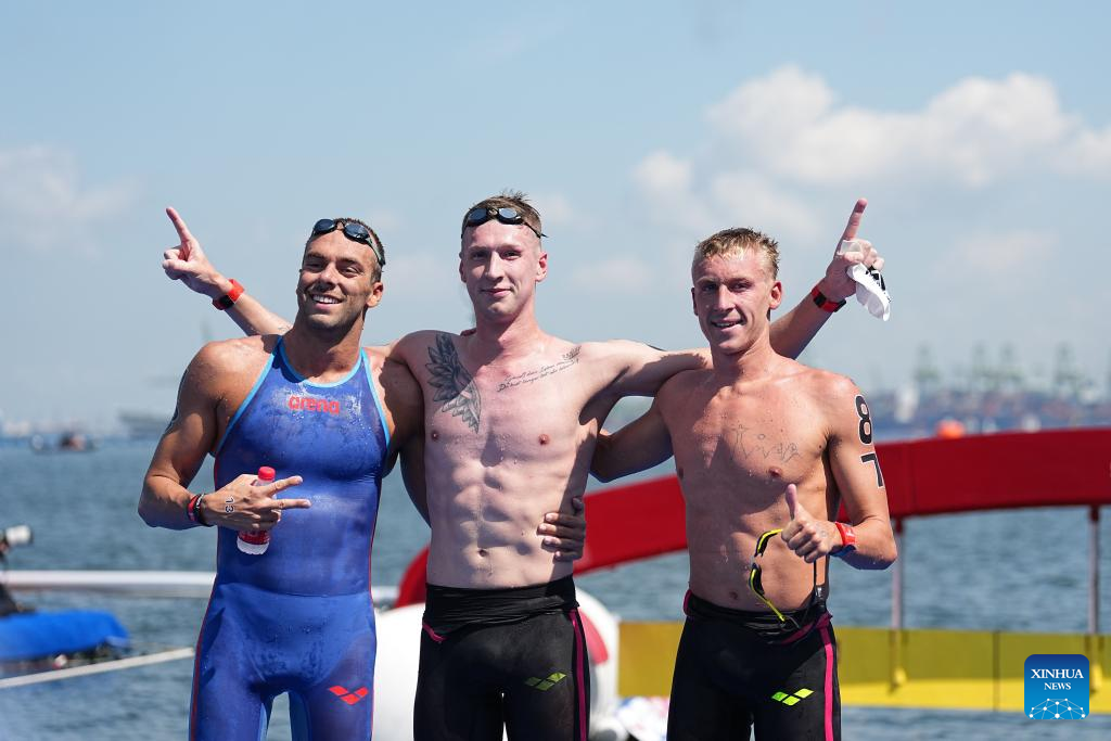 Gold medalist Florian Wellbrock (C) of Germany, silver medalist Gregorio Paltrinieri (L) of Italy, and bronze medalist Marc-Antoine Olivier of France pose after the men's 5km final of open water at the World Aquatics Championships 2025 in Singapore, July 18, 2025. (Xinhua/Xue Yuge)