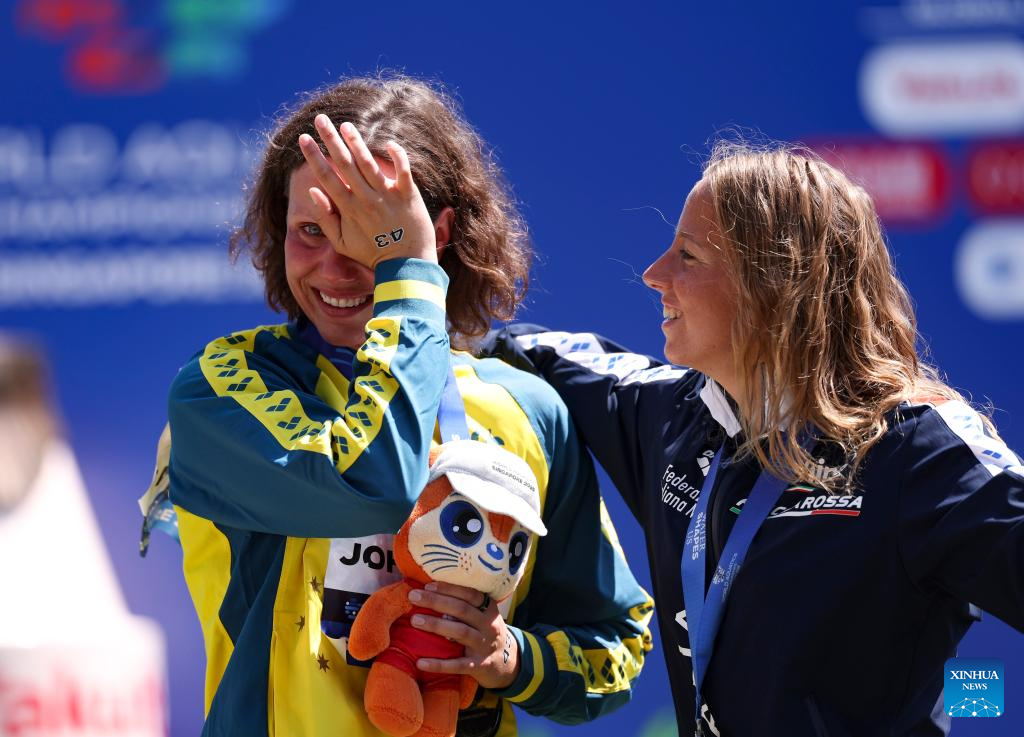 Gold medalist Moesha Johnson (L) of Australia and silver medalist Ginevra Taddeucci of Itay hug each other during the awarding ceremony after the women's 5km final of open water at the World Aquatics Championships 2025 in Singapore, July 18, 2025. (Xinhua/Luo Yuan)