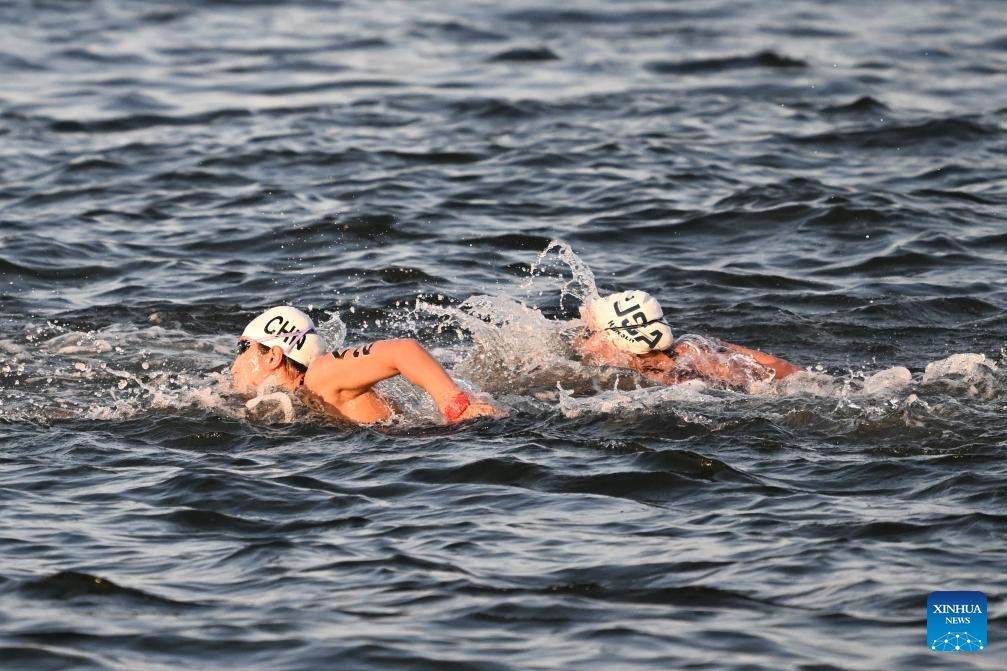 Cheng Hanyu (R) of China competes during the women's 5km final of open water at the World Aquatics Championships 2025 in Singapore, July 18, 2025. (Xinhua/Xue Yuge)