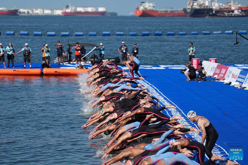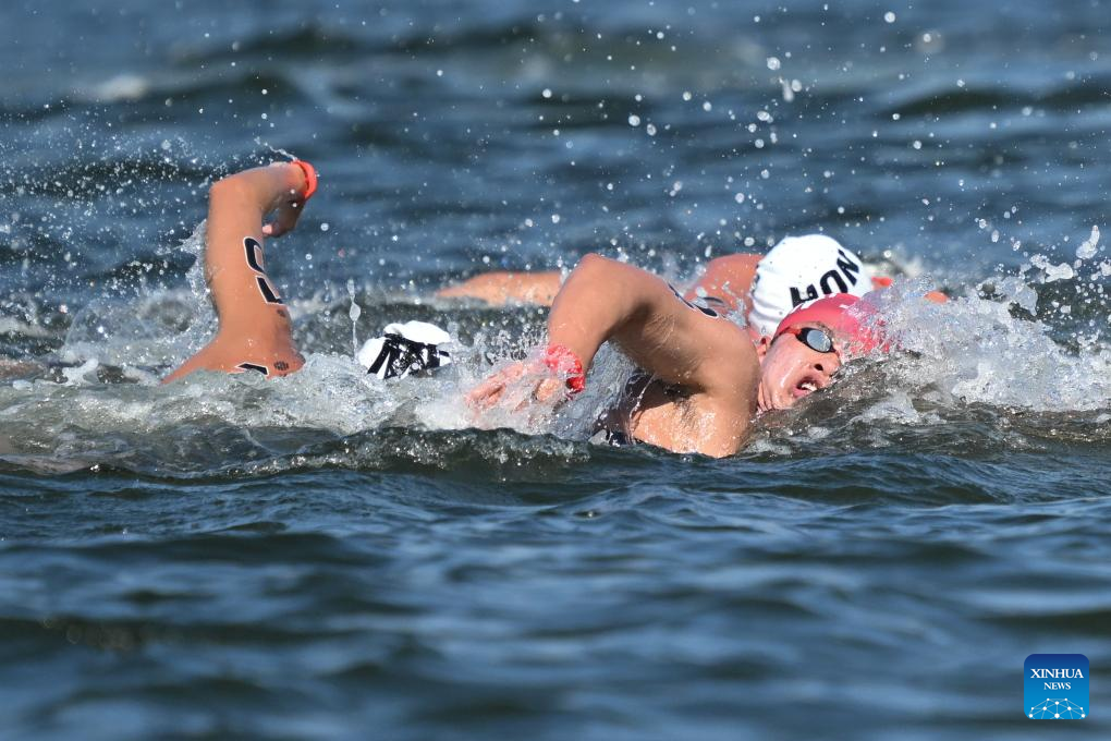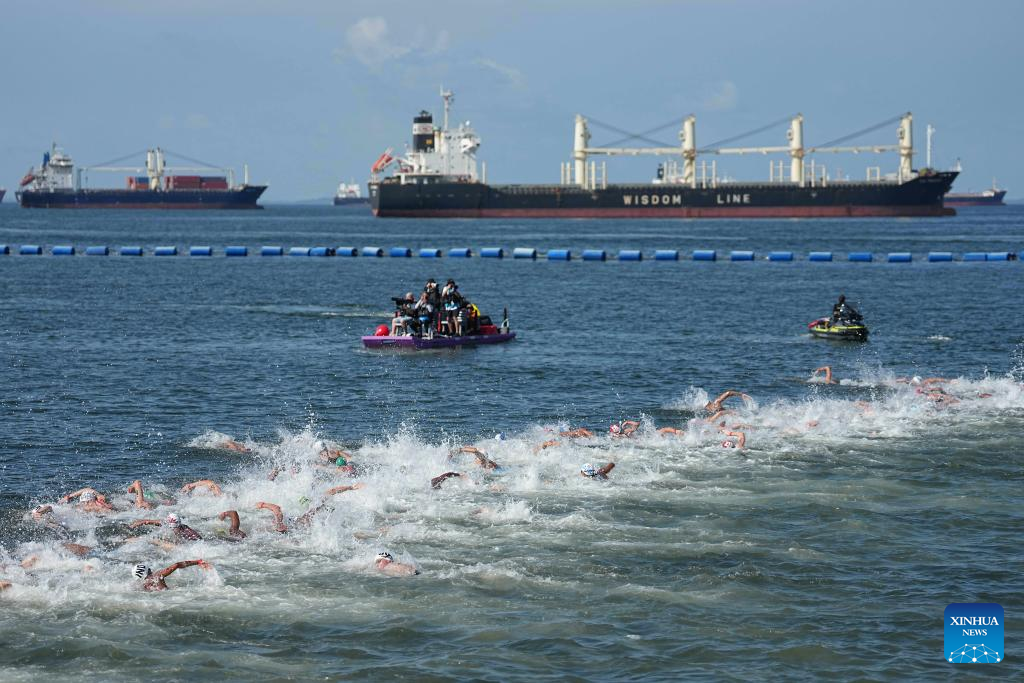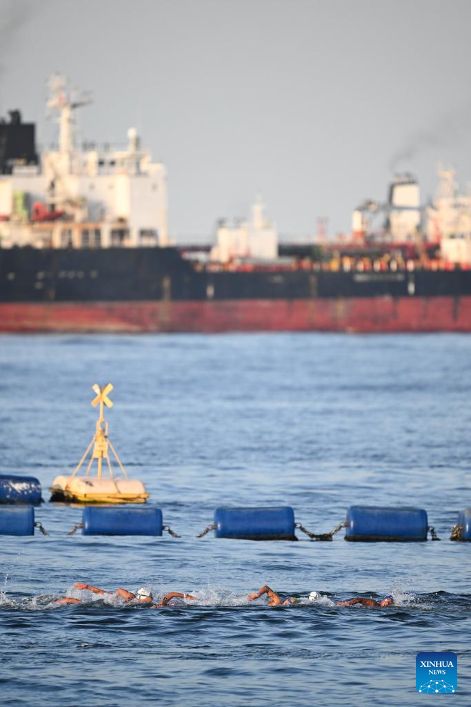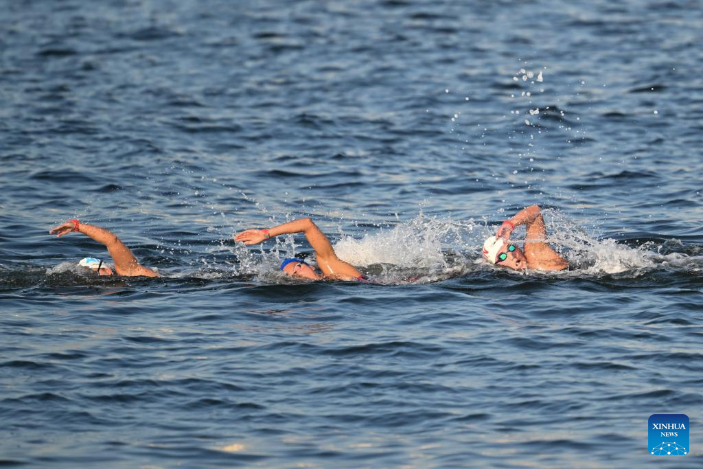 Swimmers compete during the women's 5km final of open water at the World Aquatics Championships 2025 in Singapore, July 18, 2025. (Xinhua/Xue Yuge)
