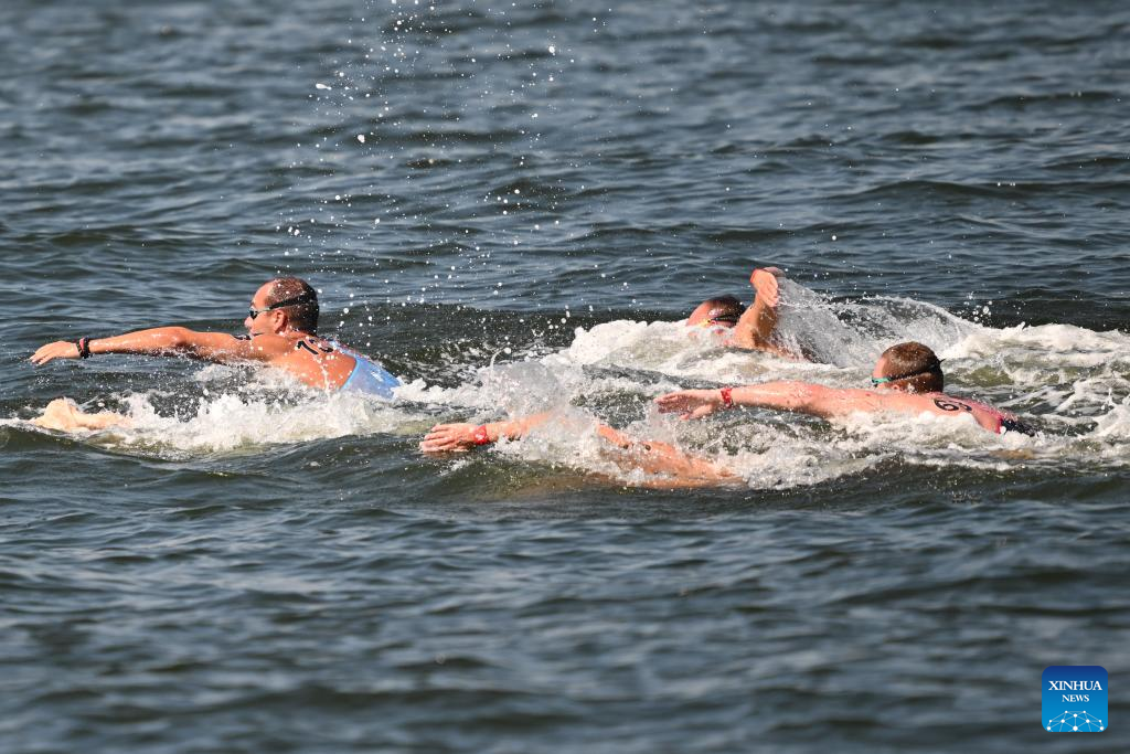 Swimmers compete during the men's 5km final of open water at the World Aquatics Championships 2025 in Singapore, July 18, 2025. (Xinhua/Luo Yuan)