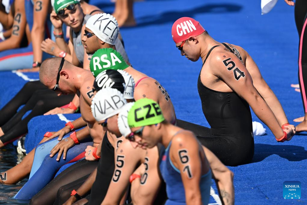 Lan Tianchen of China (1st R) warms up before the men's 5km final of open water at the World Aquatics Championships 2025 in Singapore, July 18, 2025. (Xinhua/Xue Yuge)