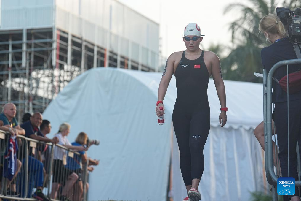 Tian Muran of China prepares before the women's 5km final of open water at the World Aquatics Championships 2025 in Singapore, July 18, 2025. (Xinhua/Xue Yuge)