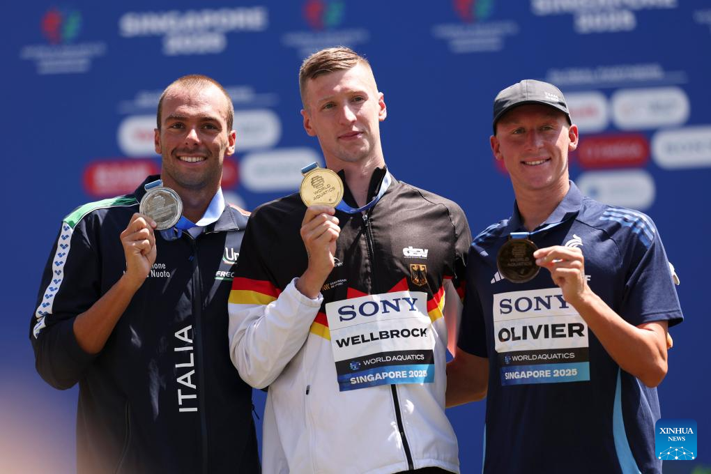 Gold medalist Florian Wellbrock (C) of Germany, silver medalist Gregorio Paltrinieri (L) of Italy and bronze medalist Marc-Antoine Olivier of France pose during the awarding ceremony for the men's 5km final of open water at the World Aquatics Championships 2025 in Singapore, July 18, 2025. (Xinhua/Luo Yuan)