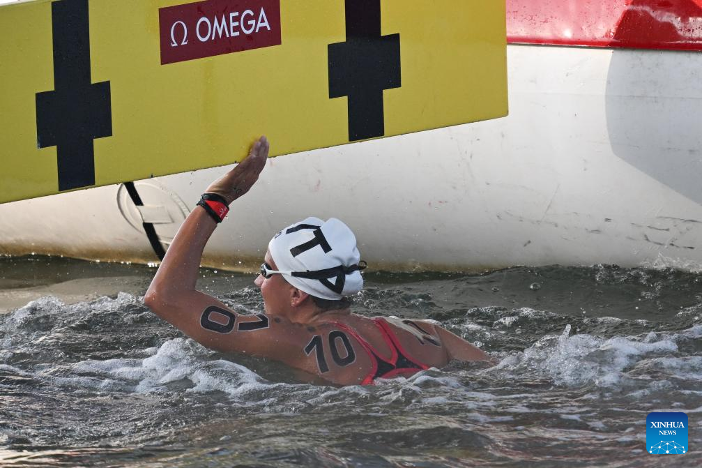 Ginevra Taddeucci of Italy reaches the finish line during the women's 5km final of open water at the World Aquatics Championships 2025 in Singapore, July 18, 2025. (Xinhua/Xue Yuge)