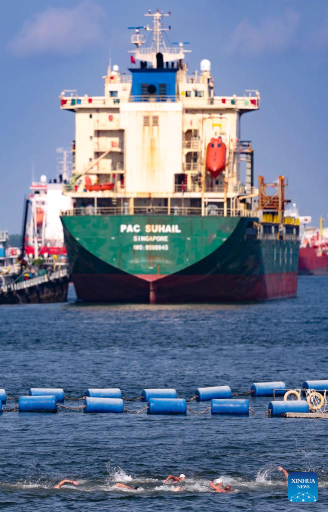 Swimmers compete during the men's 5km final of open water at the World Aquatics Championships 2025 in Singapore, July 18, 2025. (Xinhua/Xue Yuge)