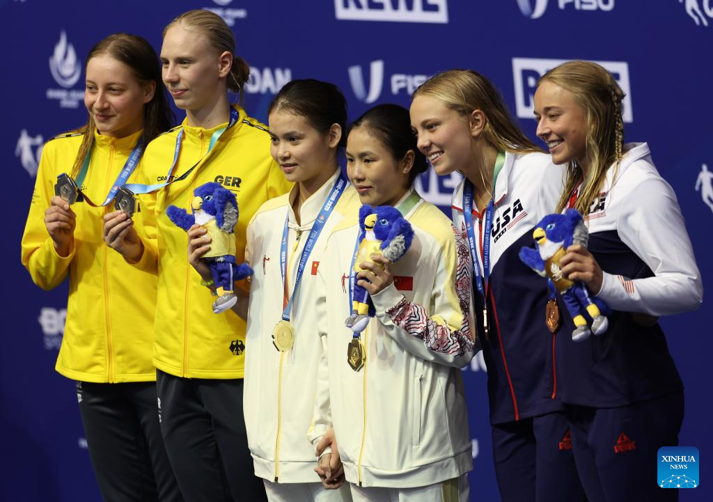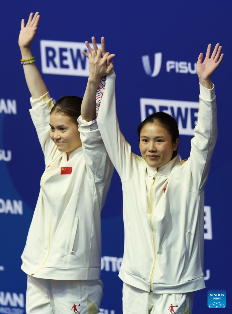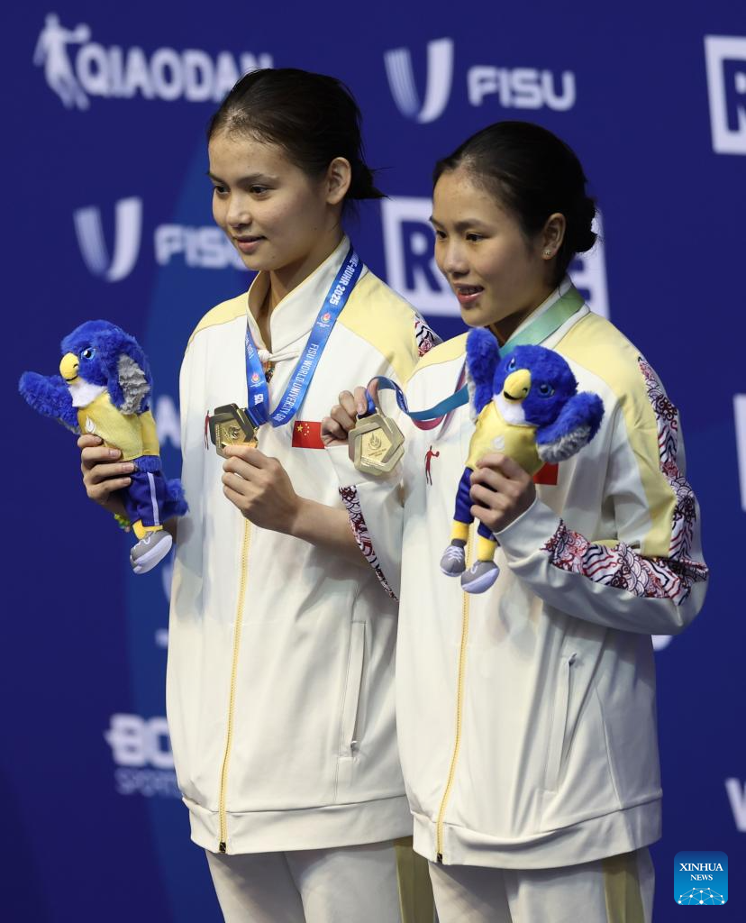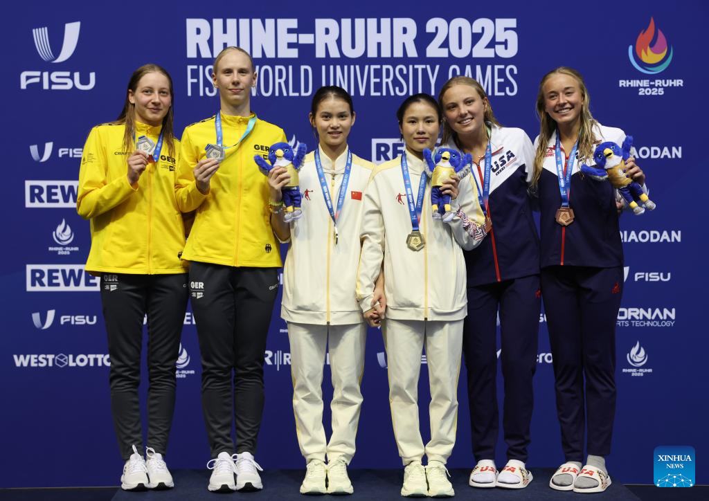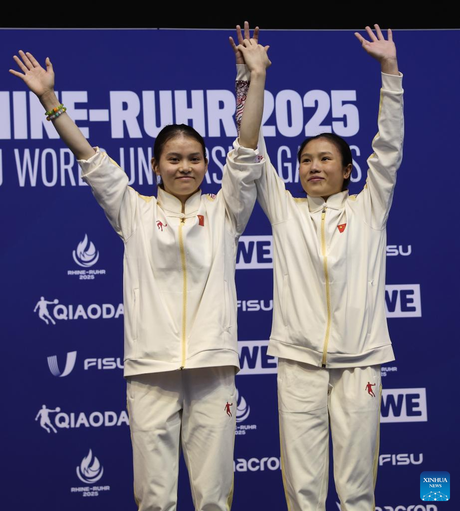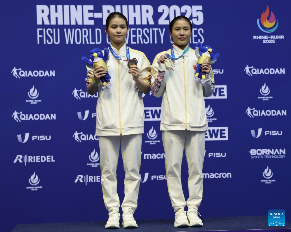 He Yanwei/Lu Wei (R) of China pose during the awarding ceremony after the women's synchronised 10m platform final of diving at the Rhine-Ruhr 2025 FISU World University Games in Berlin, Germany, July 17, 2025. (Xinhua/Li Ying)