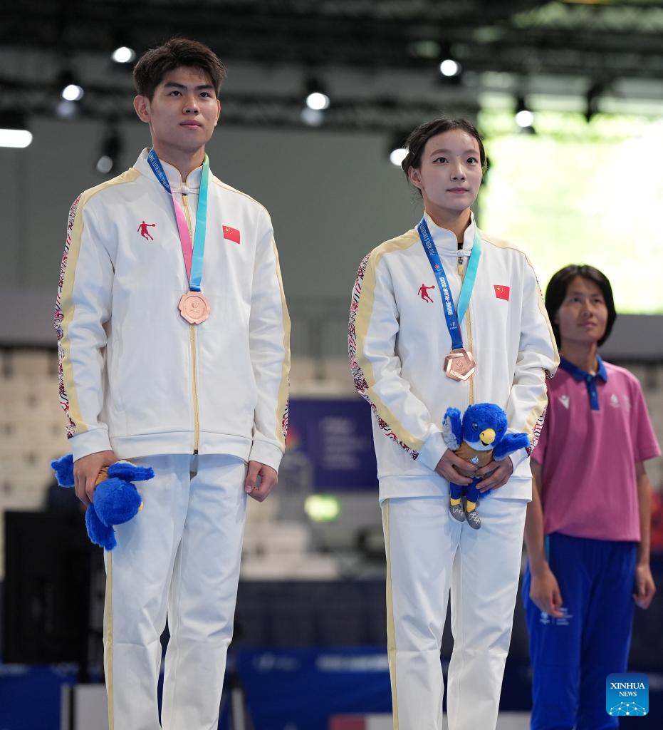 Bronze medalists Fan Yi (L)/Mei Yingxin of China react during the awarding ceremony for the mixed pair poomsae final of Taekwondo at the Rhine-Ruhr 2025 FISU World University Games in Essen, Germany, July 17, 2025. (Xinhua/Wang Xi)