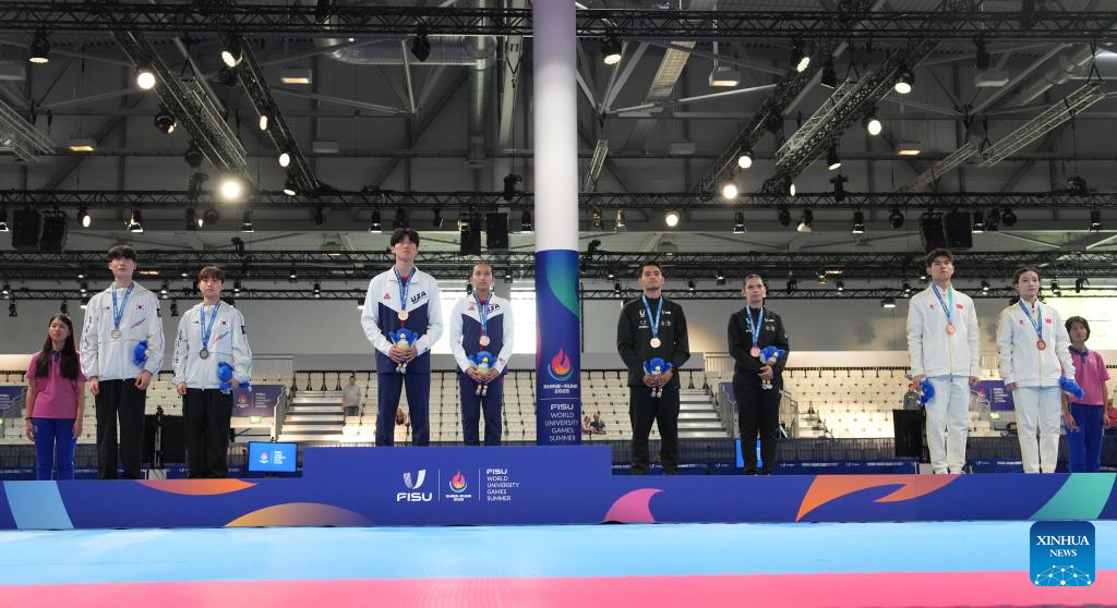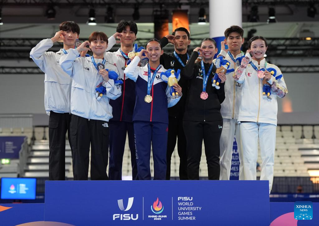 Medalists react during the awarding ceremony for the mixed pair poomsae final of Taekwondo at the Rhine-Ruhr 2025 FISU World University Games in Essen, Germany, July 17, 2025. (Xinhua/Wang Xi)