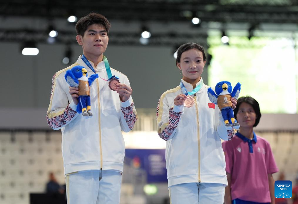 Bronze medalists Fan Yi (L)/Mei Yingxin of China pose during the awarding ceremony for the mixed pair poomsae final of Taekwondo at the Rhine-Ruhr 2025 FISU World University Games in Essen, Germany, July 17, 2025. (Xinhua/Wang Xi)