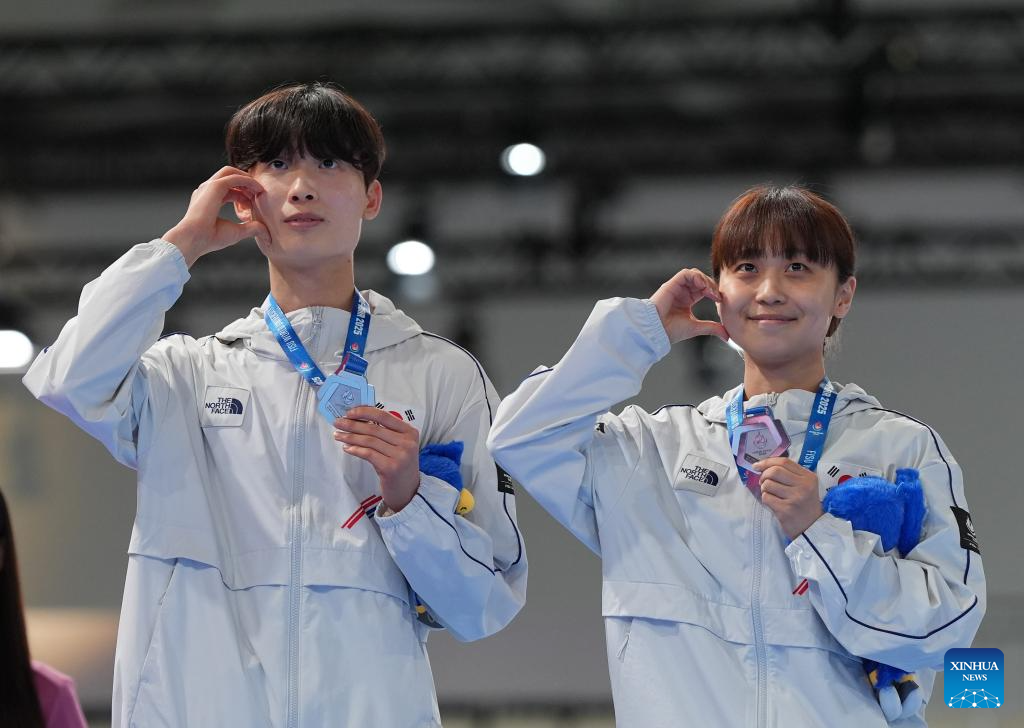 Silver medalists Kang Minjae (L)/Han Dahyun of South Korea pose during the awarding ceremony for the mixed pair poomsae final of Taekwondo at the Rhine-Ruhr 2025 FISU World University Games in Essen, Germany, July 17, 2025. (Xinhua/Wang Xi)