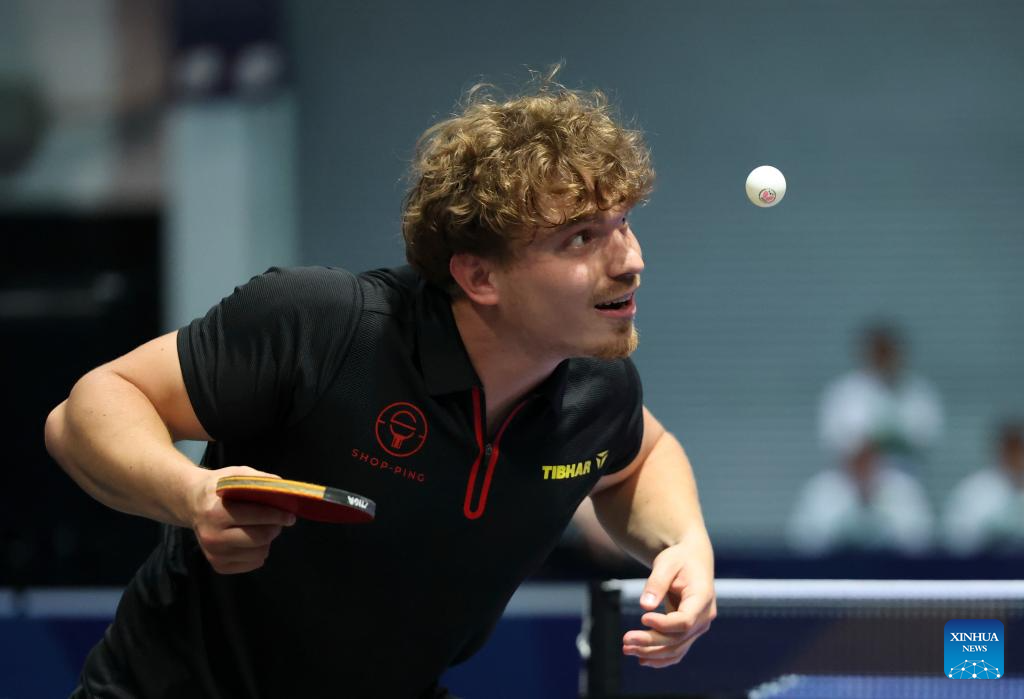 Louis Laffineur of Belgium serves during the match between China and Belgium of men's team group stage of table tennis at the Rhine-Ruhr 2025 FISU World University Games in Essen, Germany, July 17, 2025. (Xinhua/Hu Xingyu)