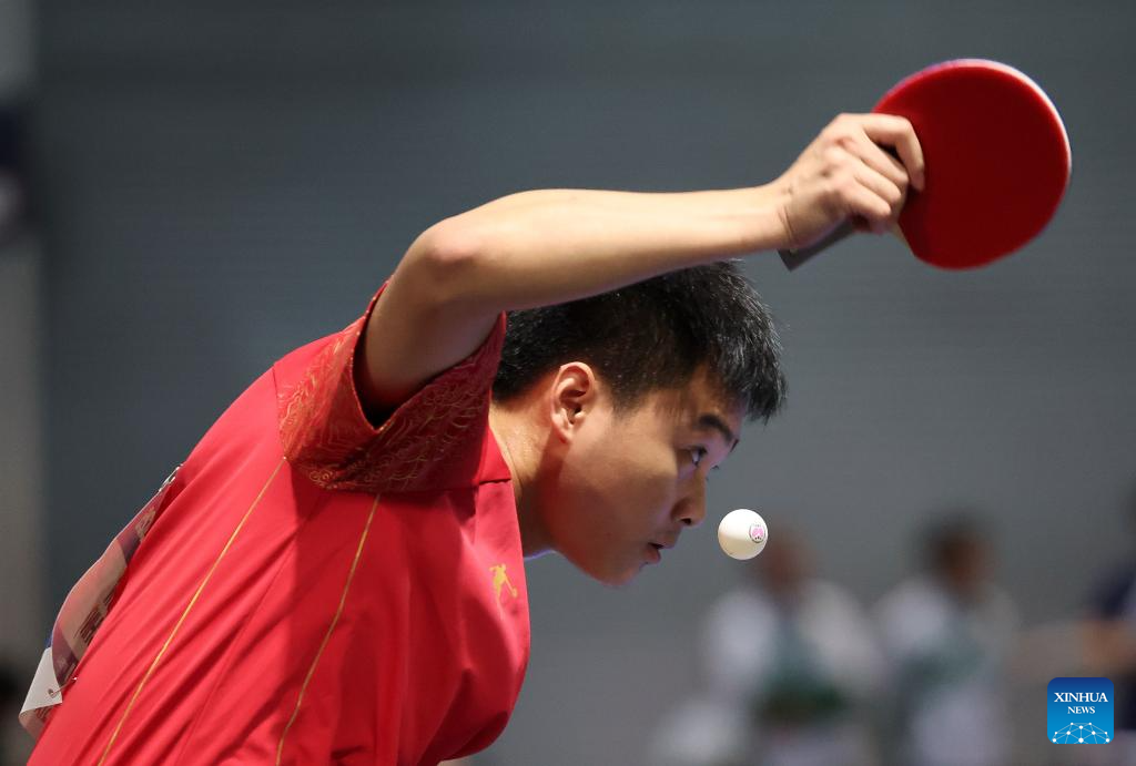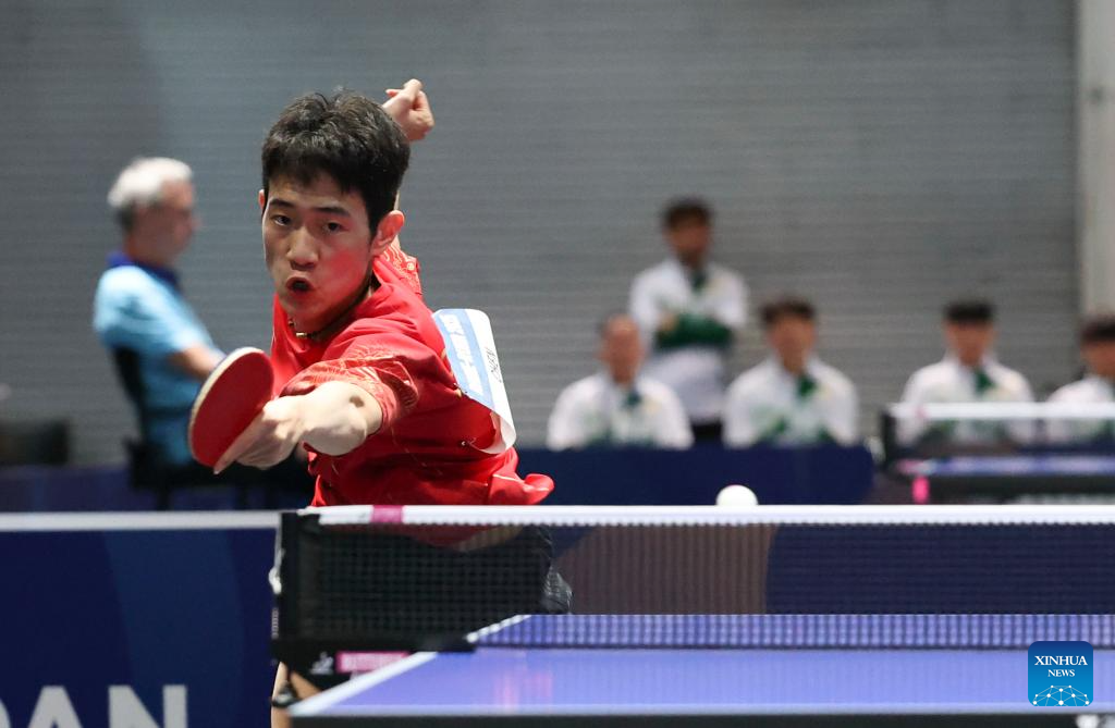 Sun Zheng of China hits a return during the match between China and Belgium of men's team group stage of table tennis at the Rhine-Ruhr 2025 FISU World University Games in Essen, Germany, July 17, 2025. (Xinhua/Hu Xingyu)