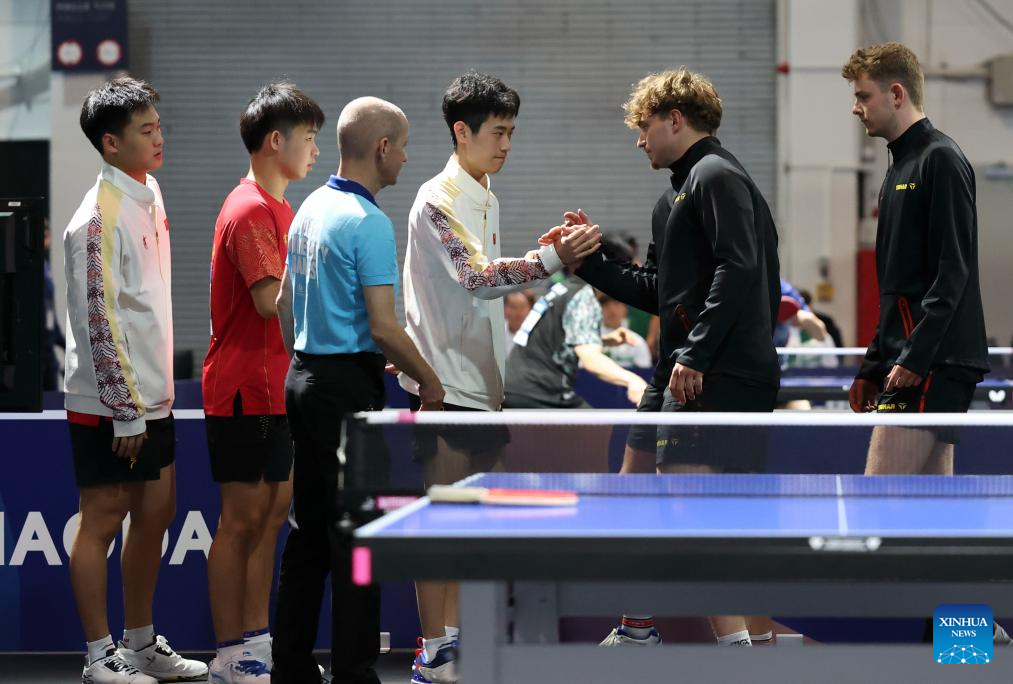 Athletes of China greets athletes of Belgium before the match between China and Belgium of men's team group stage of table tennis at the Rhine-Ruhr 2025 FISU World University Games in Essen, Germany, July 17, 2025. (Xinhua/Hu Xingyu)
