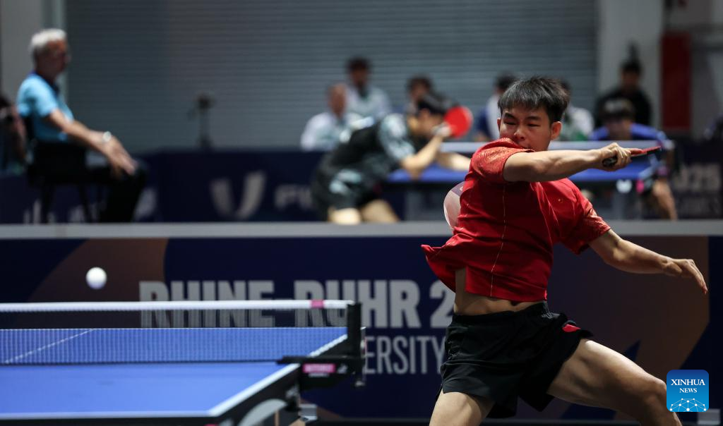 Zeng Beixun of China hits a return during the match between China and Belgium of men's team group stage of table tennis at the Rhine-Ruhr 2025 FISU World University Games in Essen, Germany, July 17, 2025. (Xinhua/Hu Xingyu)