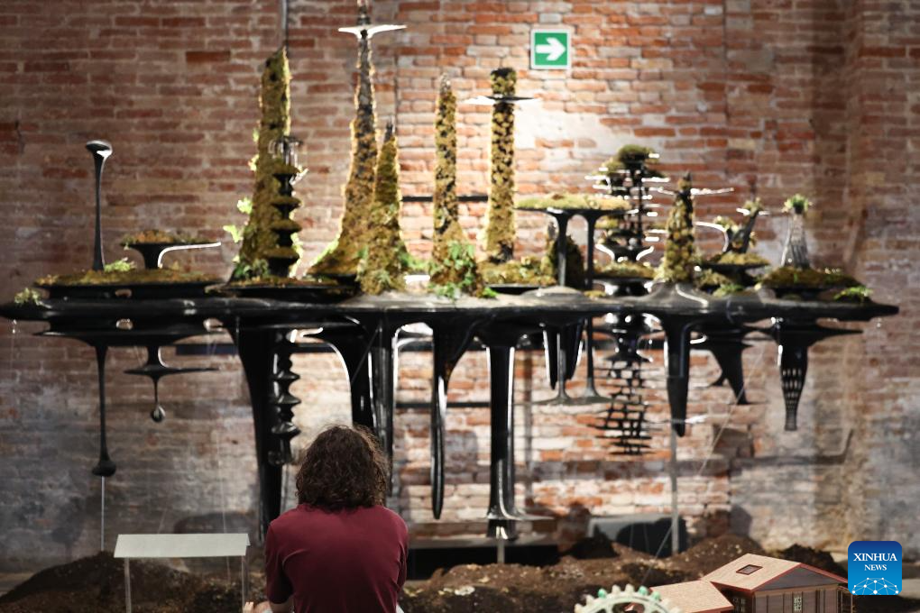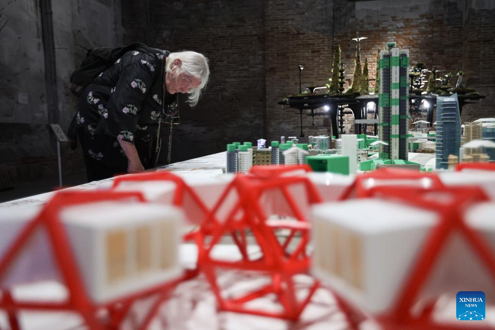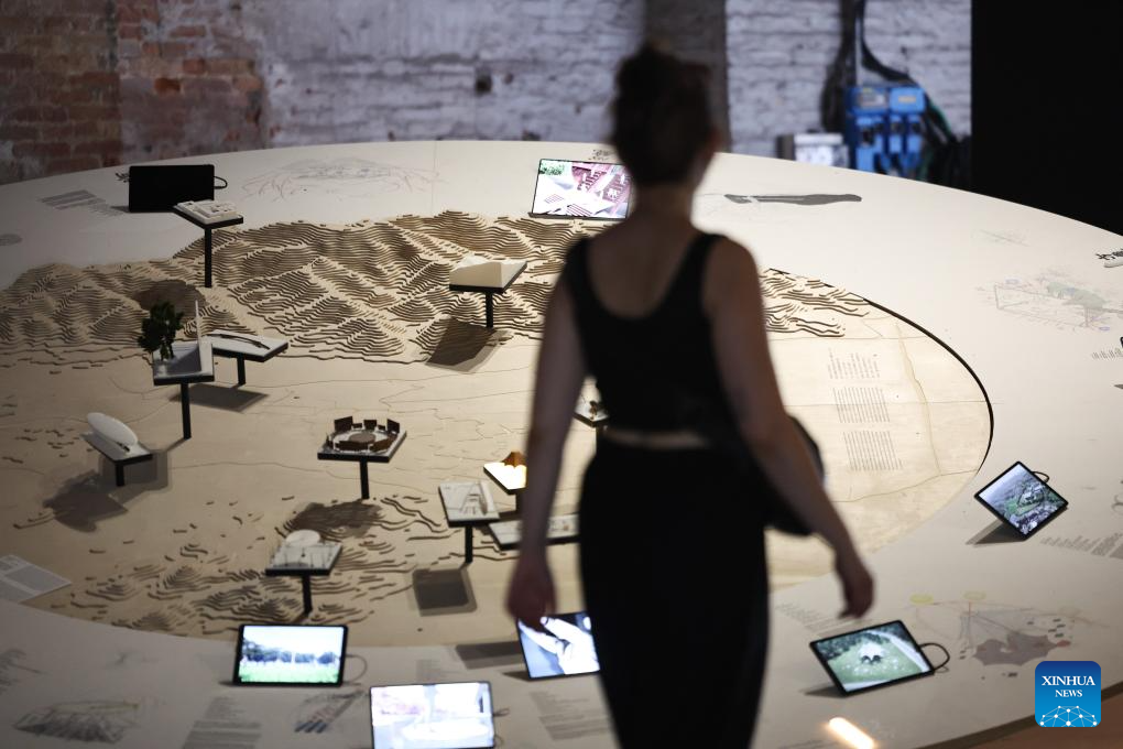 A visitor watches an exhibit named "City in China: Nature of all things" at the China's National Pavilion of the 19th International Architecture Exhibition of La Biennale di Venezia in Venice, Italy, July 16, 2025. (Xinhua/Li Jing)