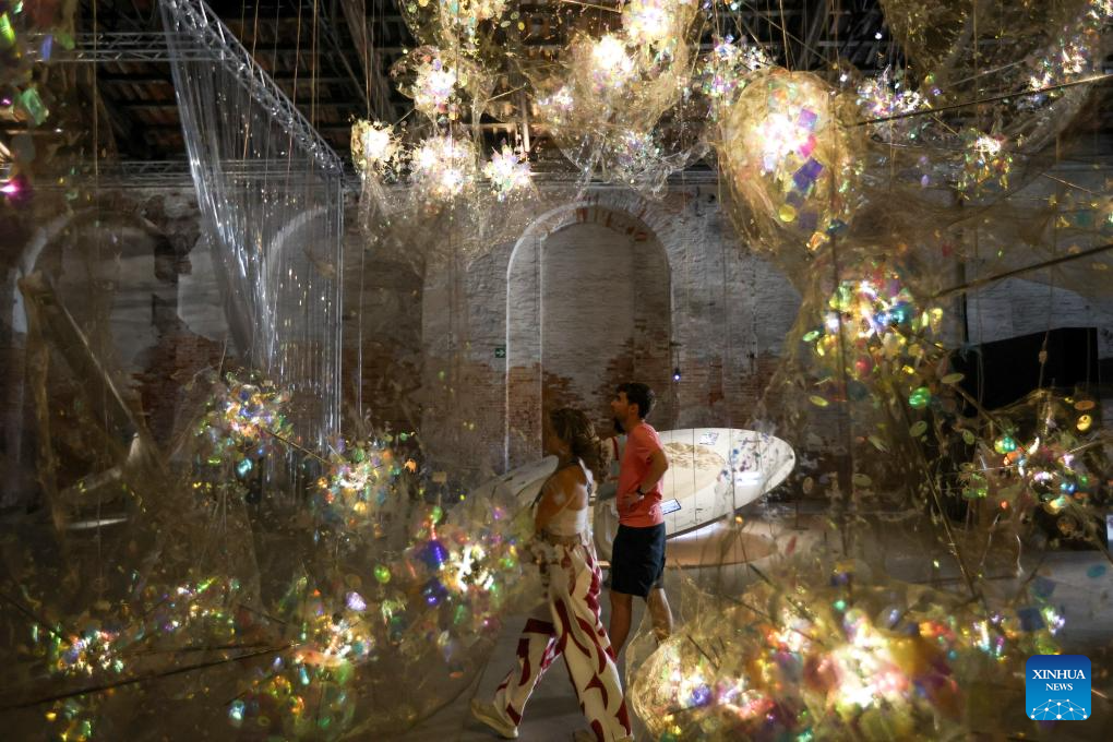 Visitors watch an exhibit named "Vault of Heaven" at the China's National Pavilion of the 19th International Architecture Exhibition of La Biennale di Venezia in Venice, Italy, July 16, 2025. (Xinhua/Li Jing)