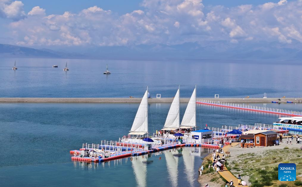 A drone photo shows electric sailing boats at Sayram Lake scenic area in Bortala Mongolian Autonomous Prefecture, northwest China's Xinjiang Uygur Autonomous Region, July 17, 2025. Nestled in the Tianshan Mountains, Sayram Lake -- Xinjiang's highest and largest alpine lake -- has emerged as a trailblazer in sustainable tourism after achieving full renewable-powered operations in July 2022. The pristine lake, a key ecological and cultural asset, has seen visitor numbers climb steadily ever since.