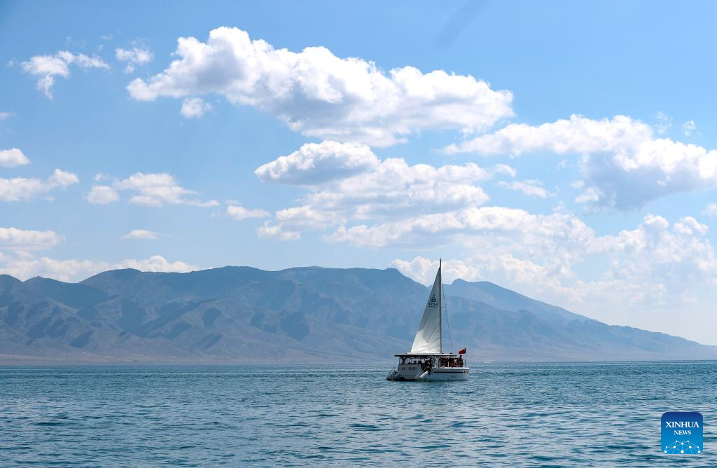 Tourists take an electric sailing boat at Sayram Lake scenic area in Bortala Mongolian Autonomous Prefecture, northwest China's Xinjiang Uygur Autonomous Region, July 17, 2025. Nestled in the Tianshan Mountains, Sayram Lake -- Xinjiang's highest and largest alpine lake -- has emerged as a trailblazer in sustainable tourism after achieving full renewable-powered operations in July 2022. The pristine lake, a key ecological and cultural asset, has seen visitor numbers climb steadily ever since.