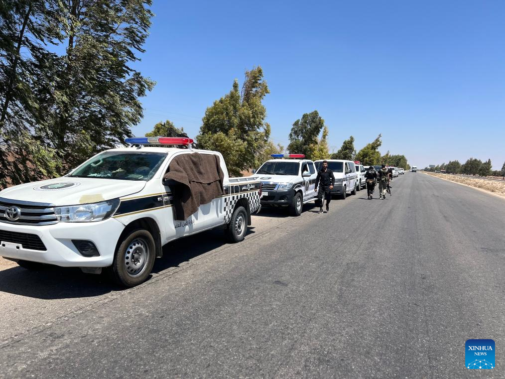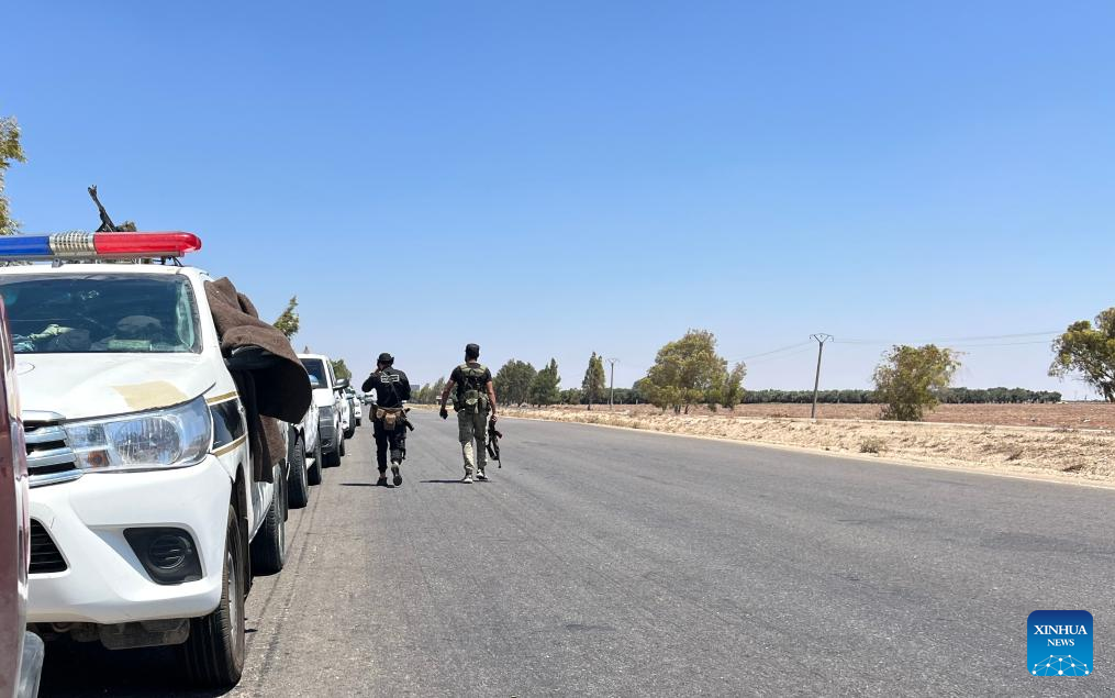 Members of Syrian security forces walk along a road lined with police vehicles on the outskirts of Sweida province, southern Syria, July 19, 2025. (Str/Xinhua)