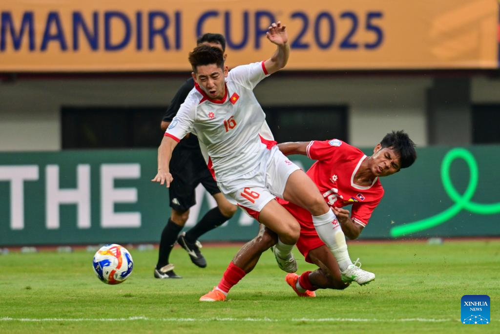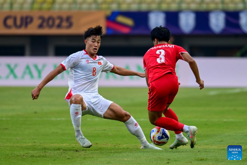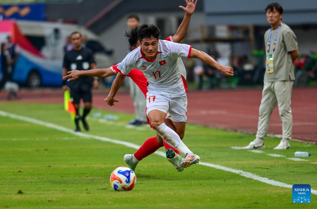 Nguyen Phi Hoang (front) of Vietnam competes during the ASEAN Football Federation (AFF) U23 Championship 2025 Group A match between Laos and Vietnam in Bekasi, Indonesia, July 19, 2025. (Xinhua/Zulkarnain)