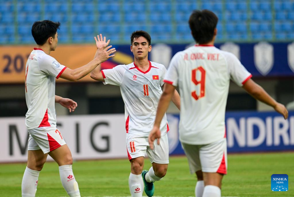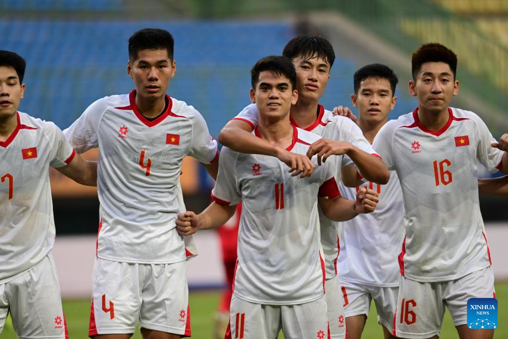 Players of Vietnam celebrate scoring during the ASEAN Football Federation (AFF) U23 Championship 2025 Group A match between Laos and Vietnam in Bekasi, Indonesia, July 19, 2025. (Xinhua/Zulkarnain)