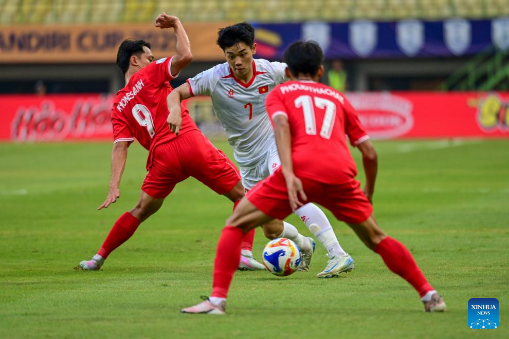 Nguyen Dinh Bac (C) of Vietnam vies with Khonesavanh Keonuchanh (L) of Laos during the ASEAN Football Federation (AFF) U23 Championship 2025 Group A match between Laos and Vietnam in Bekasi, Indonesia, July 19, 2025. (Xinhua/Zulkarnain)