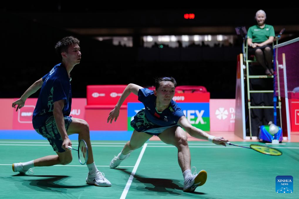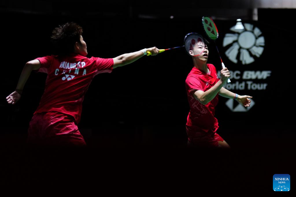 Feng Yanzhe (front)/Huang Dongping compete during during the mixed doubles semifinal match between Feng Yanzhe/Huang Dongping of China and Dechapol Puavaranukroh/Supissara Paewsampran of Thailand at the Japan Badminton Open 2025 in Tokyo, Japan, July 19, 2025. (Xinhua/Jia Haocheng)