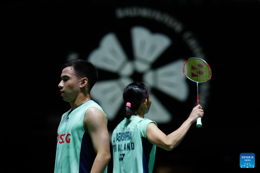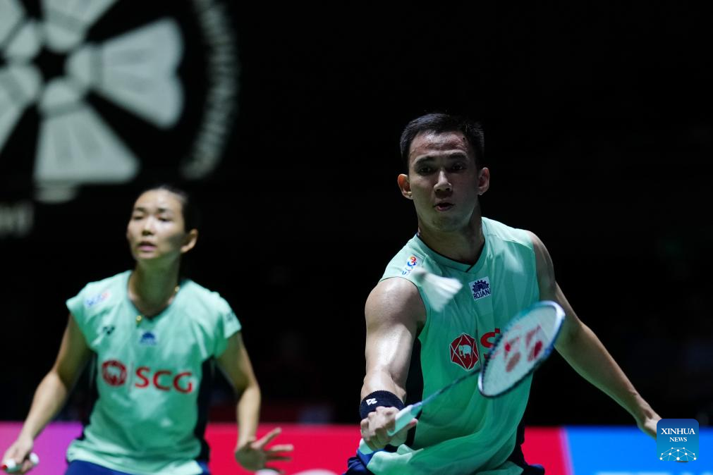Dechapol Puavaranukroh (R)/Supissara Paewsampran compete during during the mixed doubles semifinal match between Feng Yanzhe/Huang Dongping of China and Dechapol Puavaranukroh/Supissara Paewsampran of Thailand at the Japan Badminton Open 2025 in Tokyo, Japan, July 19, 2025. (Xinhua/Jia Haocheng)