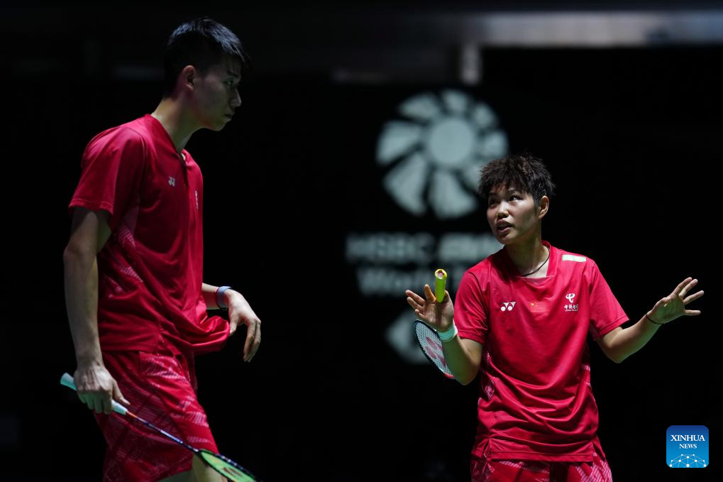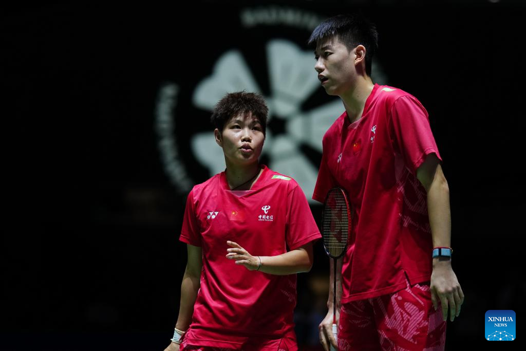 Feng Yanzhe/Huang Dongping (R) communicate during during the mixed doubles semifinal match between Feng Yanzhe/Huang Dongping of China and Dechapol Puavaranukroh/Supissara Paewsampran of Thailand at the Japan Badminton Open 2025 in Tokyo, Japan, July 19, 2025. (Xinhua/Jia Haocheng)