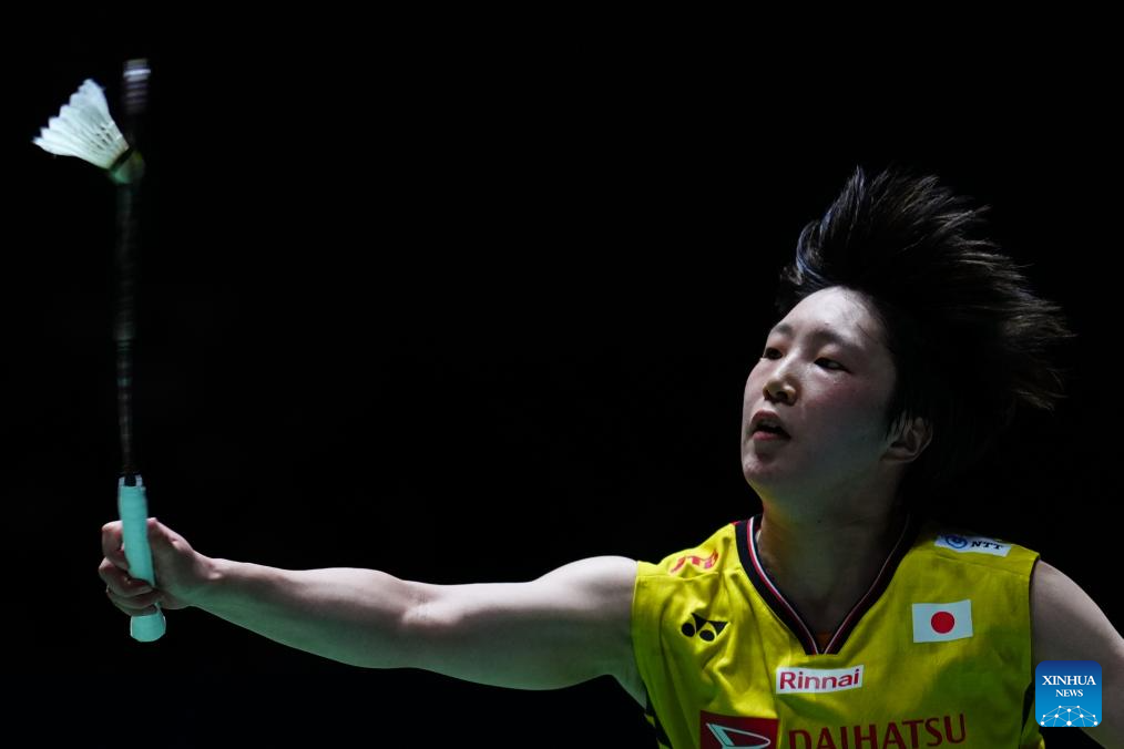 Yamaguchi Akane hits a return during the women's singles semifinal match between Wang Zhiyi of China and Yamaguchi Akane of Japan at the Japan Badminton Open 2025 in Tokyo, Japan, July 19, 2025. (Xinhua/Jia Haocheng)