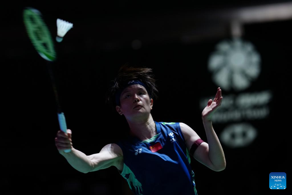 Wang Zhiyi hits a return during the women's singles semifinal match between Wang Zhiyi of China and Yamaguchi Akane of Japan at the Japan Badminton Open 2025 in Tokyo, Japan, July 19, 2025. (Xinhua/Jia Haocheng)