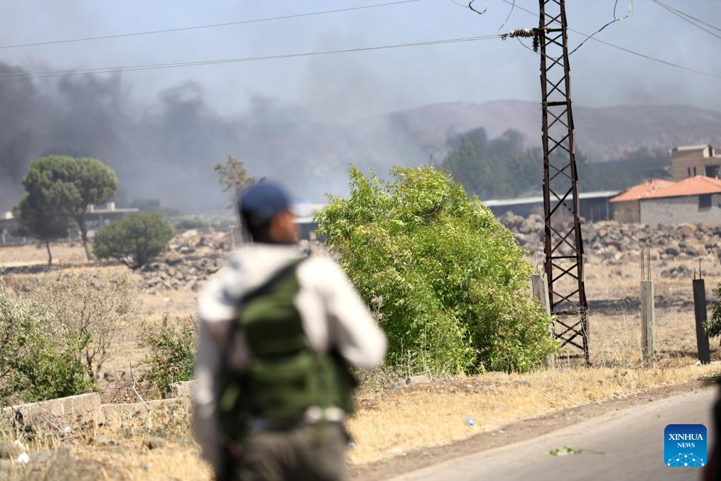 Smoke rises during clashes in the town of Wolgha, western countryside of Sweida, southern Syria, on July 18, 2025. The Syrian interim authorities on Friday issued a call for restraint amid escalating violence in the southern province of Sweida, pledging to deploy forces to contain the conflict. (Str/Xinhua)