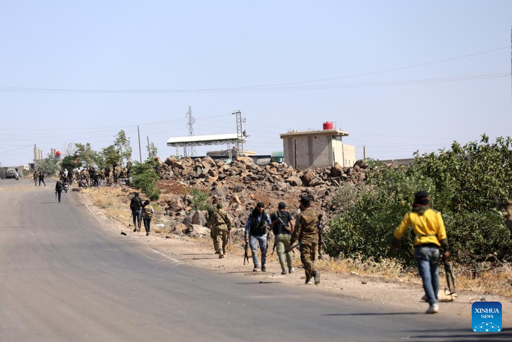 Tribal fighters walk along a road near a frontline in the town of Wolgha, western countryside of Sweida, southern Syria, on July 18, 2025. The Syrian interim authorities on Friday issued a call for restraint amid escalating violence in the southern province of Sweida, pledging to deploy forces to contain the conflict. (Str/Xinhua)