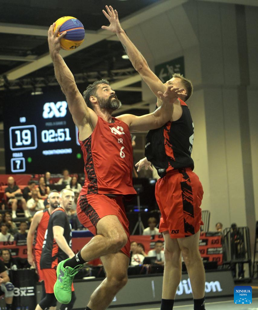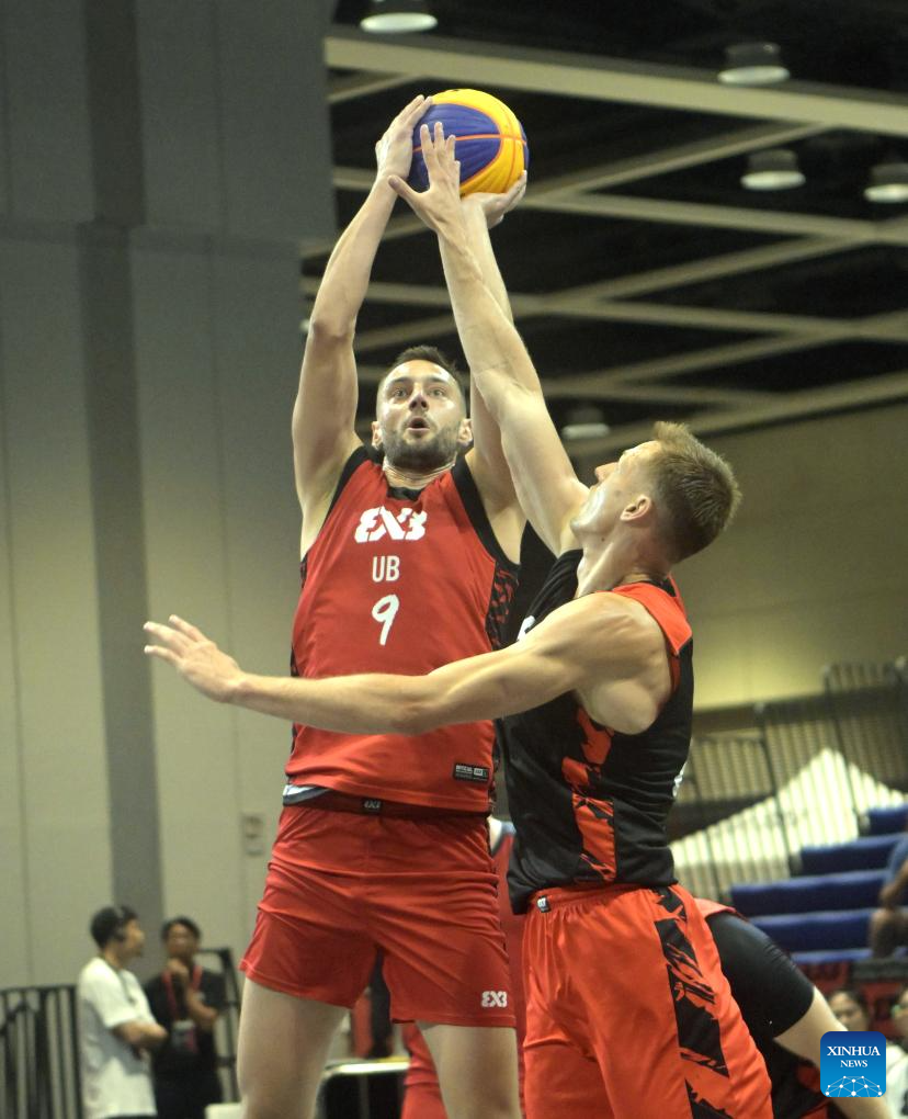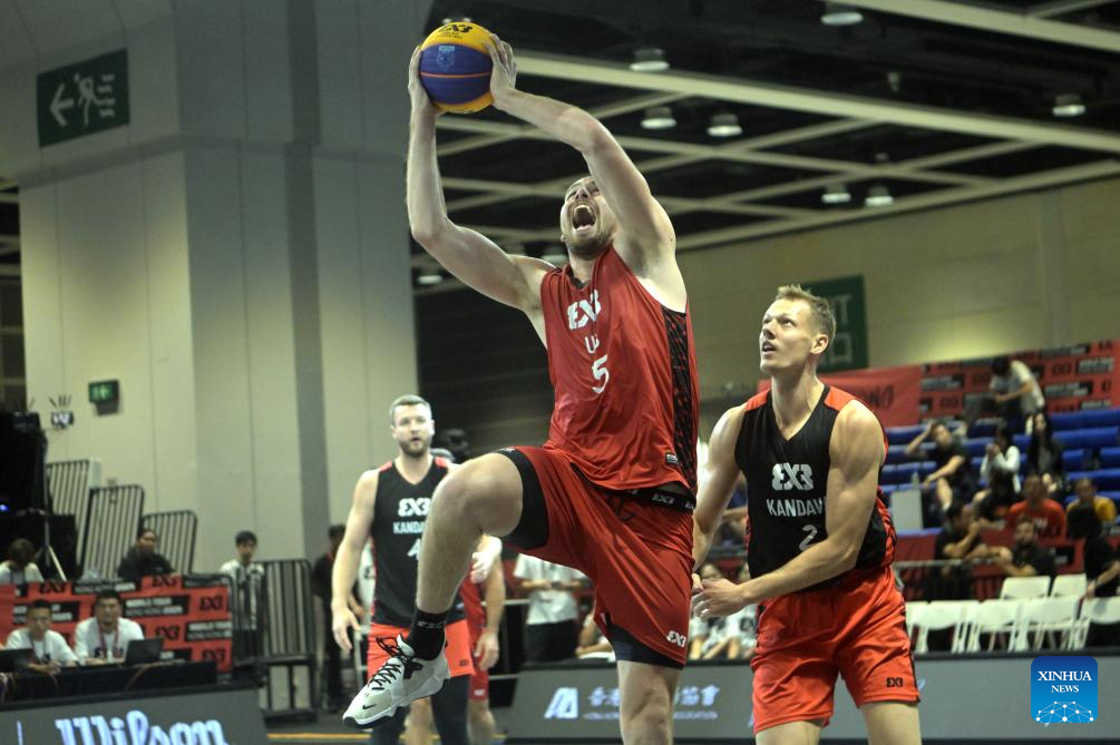 Nenad Nerandzic (C) of Ub goes for a layup during the group match between Ub of Serbia and Kandava turiba of Latvia at the International Basketball Federation (FIBA) 3x3 World Tour Hong Kong 2025 in Hong Kong, south China, July 19, 2025. (Xinhua/Lo Ping Fai)