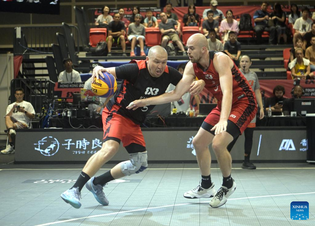 Nemanja Barac (L) of Ub goes for a layup during the group match between Ub of Serbia and Kandava turiba of Latvia at the International Basketball Federation (FIBA) 3x3 World Tour Hong Kong 2025 in Hong Kong, south China, July 19, 2025. (Xinhua/Lo Ping Fai)