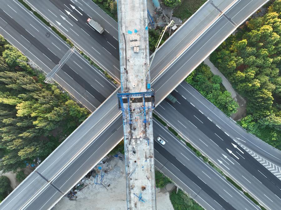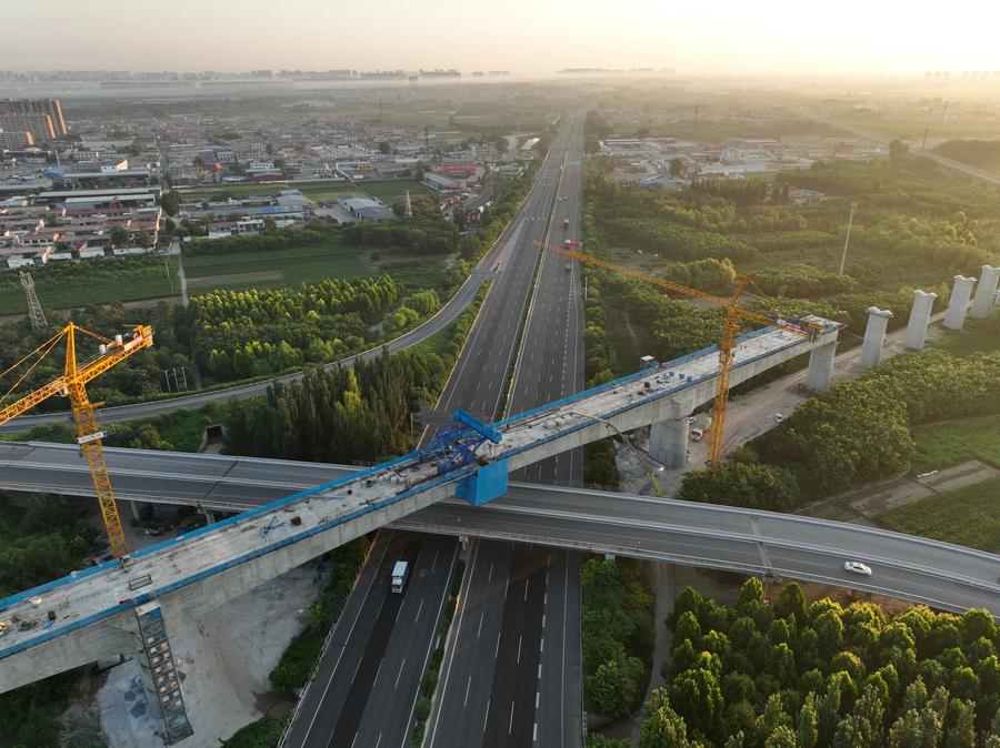 BAODING, July 19 (Xinhua) -- A key segment of the Xiong'an-Xinzhou high-speed railway was completed on Friday. Engineers successfully closed the middle span of a major bridge crossing above the busy Beijing-Hong Kong-Macao Expressway in Baoding, north China's Hebei Province. The section was constructed by China Railway 14th Bureau Group Co., Ltd.