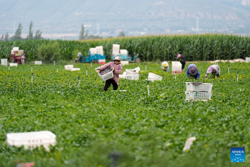 Staff members harvest Chinese flowering cabbages at a cool-season vegetable base in Guyuan, northwest China's Ningxia Hui Autonomous Region, July 18, 2025. Leveraging its high-altitude terrain and cold-weather advantages, Guyuan has vigorously developed its cool-season vegetable industry in recent years. (Xinhua/Wang Peng)